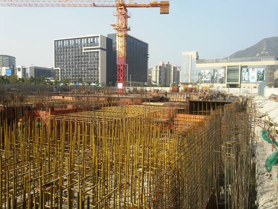 1-5軸一層樓房柱筋安裝,6-10軸一層支樓架搭設(shè),11-16軸地下室頂梁板筋安裝。